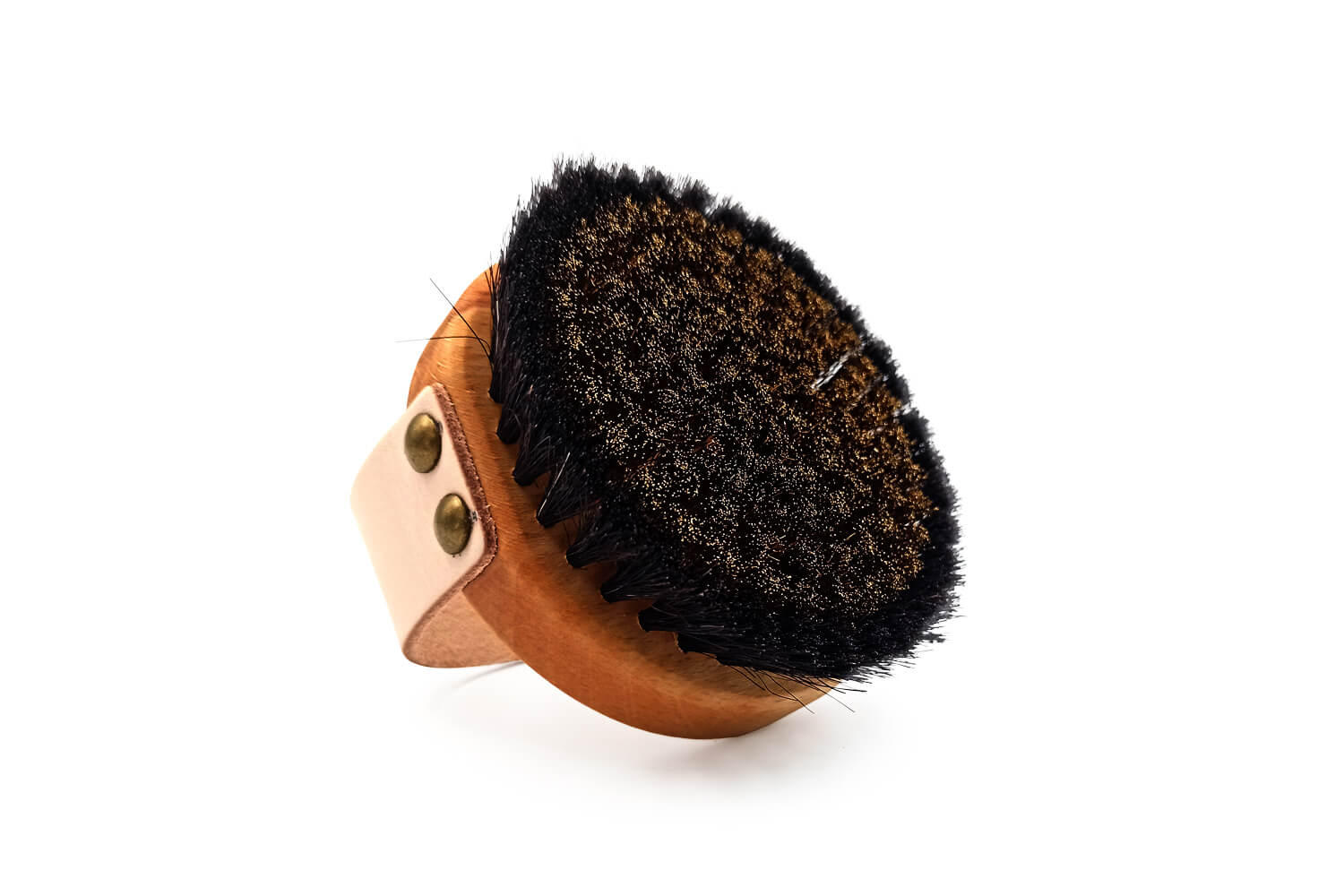 Um eine lange Lebensdauer der Bürste zu gewährleisten, wird der Holzrücken der Bürste aus geöltem Buchenholz hergestellt. Dieses spezielle Holz wird aus nachhaltiger Land- und Forstwirtschaft im Schwarzwald produziert. Die Form der Bürste ist mit einer runden Größe von 100 mm komfortabel und handlich.